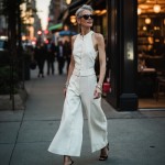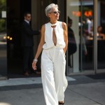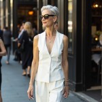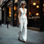 Imagine a 40-year-old woman who is highly stylish and very pretty. Hair is short silver gray and stylish. She is wearing a long fitted jewel neck white vest, no collar, in white with buttons. She is wearing matching white wide-leg long trousers in the same fabric and black dressy thong high-heeled sandals. Two silver bangle bracelets. Put her in an urban setting