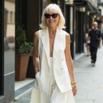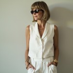 Imagine a 40-year-old woman who is highly stylish and very pretty. Hair is in an Anna Wintour bob to cheekbones with bangs. She is wearing a white westkit vest that reaches her hips. No shirt underneath. the vest is fully buttoned. pants are matching white fabric and are long and full. shoes are black, thong high heel sandals. she is wearing only two large gold bangle bracelets and sunglasses