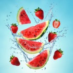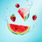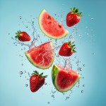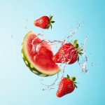 Ultra-realistic composition of juicy watermelon slices and ripe strawberries suspended mid-air, surrounded by water droplets. The fruits appear fresh and vibrant with glistening textures, set against a clean, soft blue background. The scene captures a dynamic sense of motion, as if the fruits have just been tossed into the air, with droplets frozen in time. The lighting is bright and natural, emphasizing the rich reds and greens of the watermelon and the glossy surface of the strawberries." Style Tags: high-speed photography, food splash, hyper-realistic, summer freshness, minimal background, vibrant colors, motion freeze