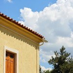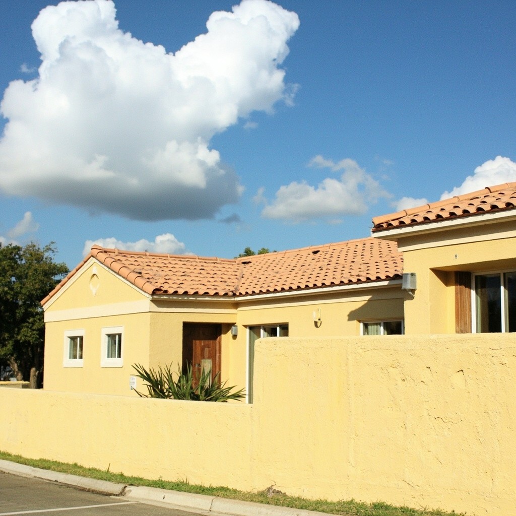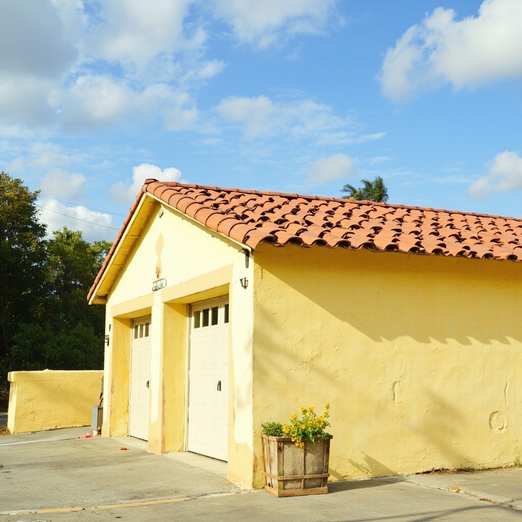 Sunny Day Spanish Building with Light Yellow Stucco Walls and Tile Roof