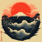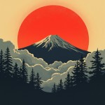Ukiyo-e Inspired Sunset at Mount Fuji with Pine Trees