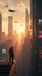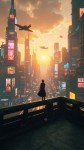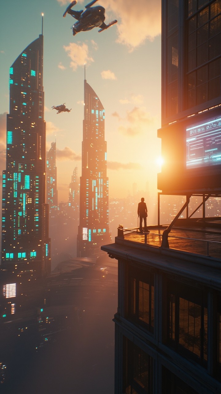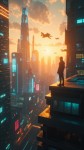 "Create a 10-second cinematic AI video of a futuristic city at sunset. Flying cars zoom past neon-lit skyscrapers, holographic billboards flicker, and a lone character stands on a rooftop overlooking the city. The scene has cinematic lighting, realistic textures, and a subtle golden-orange glow reflecting off glass buildings. Smooth camera movement, slightly dramatic music vibe."