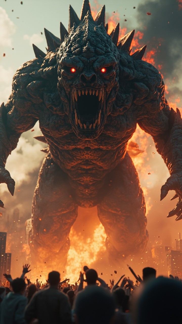 Terrifying Monster Emerging from Destroyed Lab with City Skyline Background