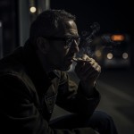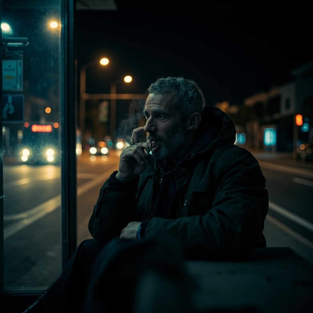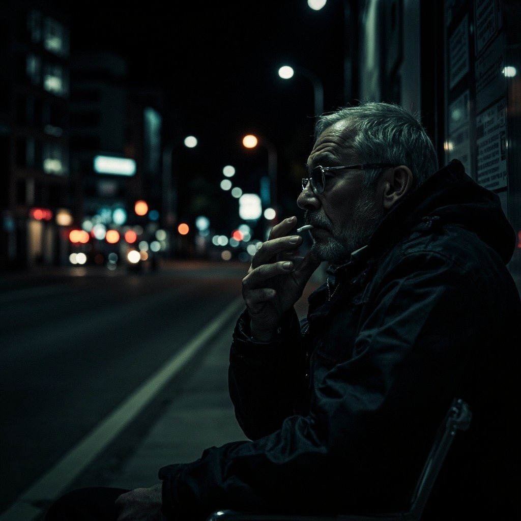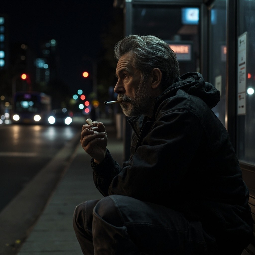 Thoughtful Athletic 40-Year-Old Man Smoking at Bus Stop at Night