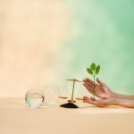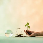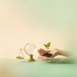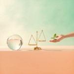 A minimalist pastel-toned conceptual image representing ethics and CSR in management. Soft peach and mint gradient background with three symbolic elements: a transparent glass globe (ethics), a small golden balance scale (responsibility), and a hand placing a young plant into soil (sustainability). Delicate shadows, ultra-clean composition, no people or text. Light airy atmosphere with slight bokeh effect.