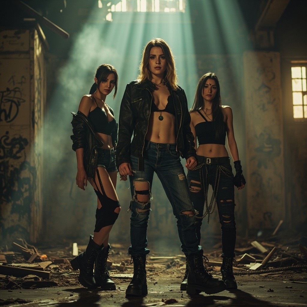 Highly detailed photograph (realism, cinematic style), three girls in stylish post-apocalyptic clothes sitting on a rusty metal barrel inside an abandoned warehouse. Composition: one girl in the center (dominant pose, confident gaze), the other two on the sides (relaxed, but with a hint of aggression). Clothing: leather jackets, ripped jeans, spiked boots, accessories (chains, bandanas). Background: huge ruined warehouse with peeling paint, protruding beams, graffiti on the walls (inscriptions, symbols), broken windows with dim light. Lighting: contrasting (rays through cracks, smoke in the air), warm and cold colors. Mood: brutal, gangster, slight chaos. Style: 'The Last of Us' + 'Mad Max', depth of field medium, texture detail (rust, cloth, dust). Sleevlesz strapless very very deep neck top Thong for bottom Translated with DeepL.com (free version)