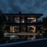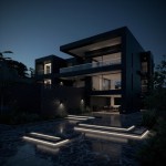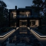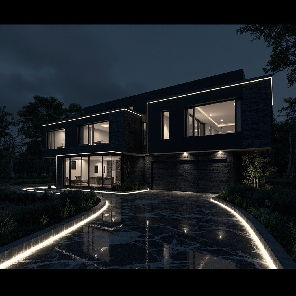 Ultra-Modern Luxury Mansion Night View with LED Lighting and Black Marble Driveway