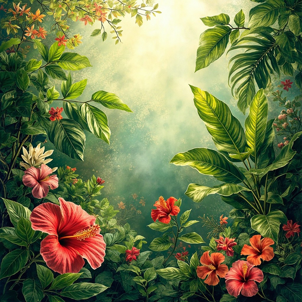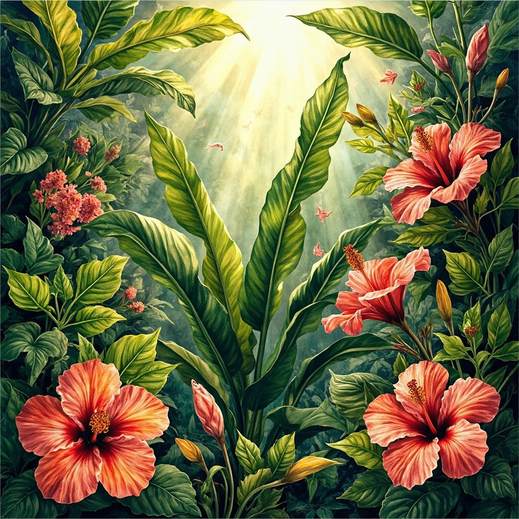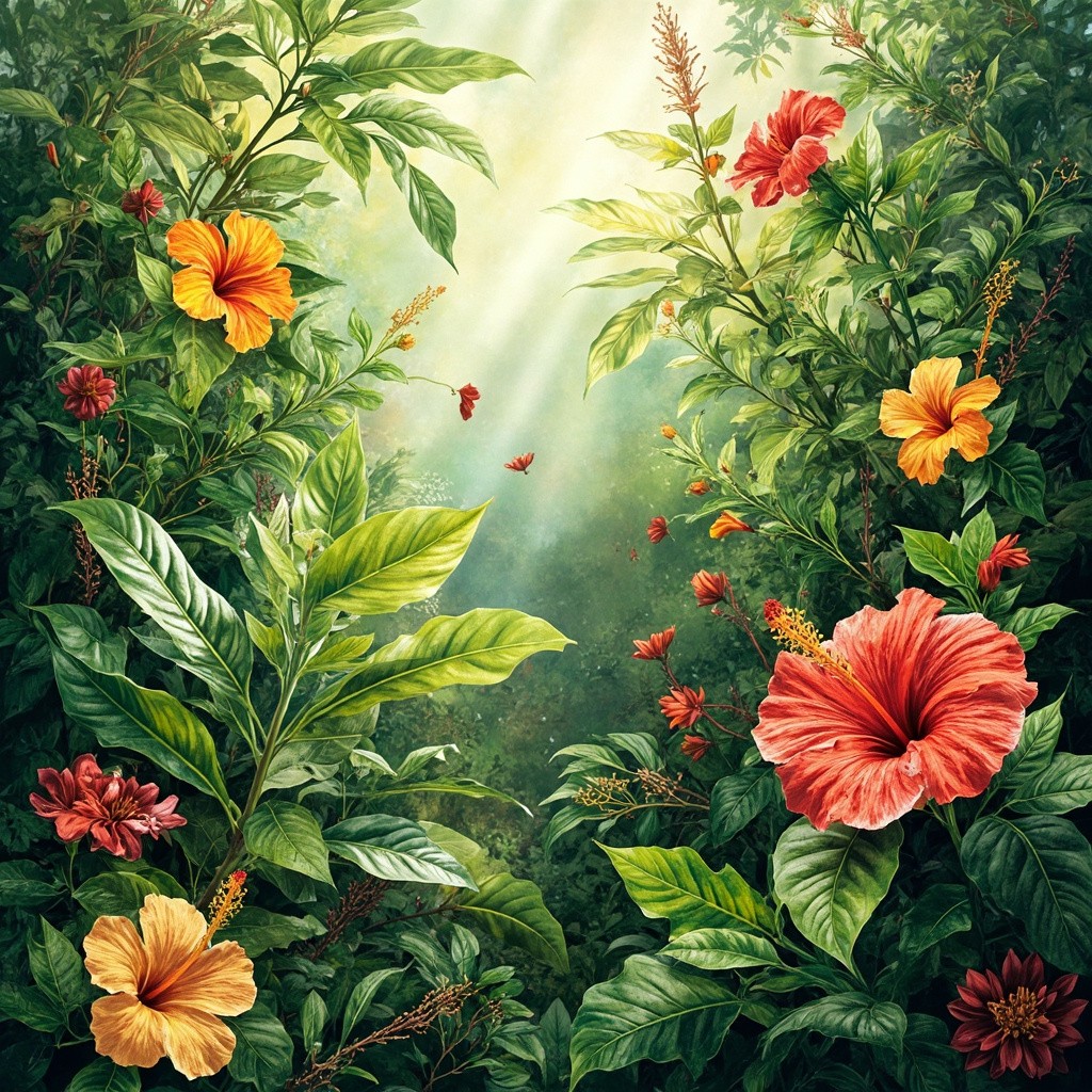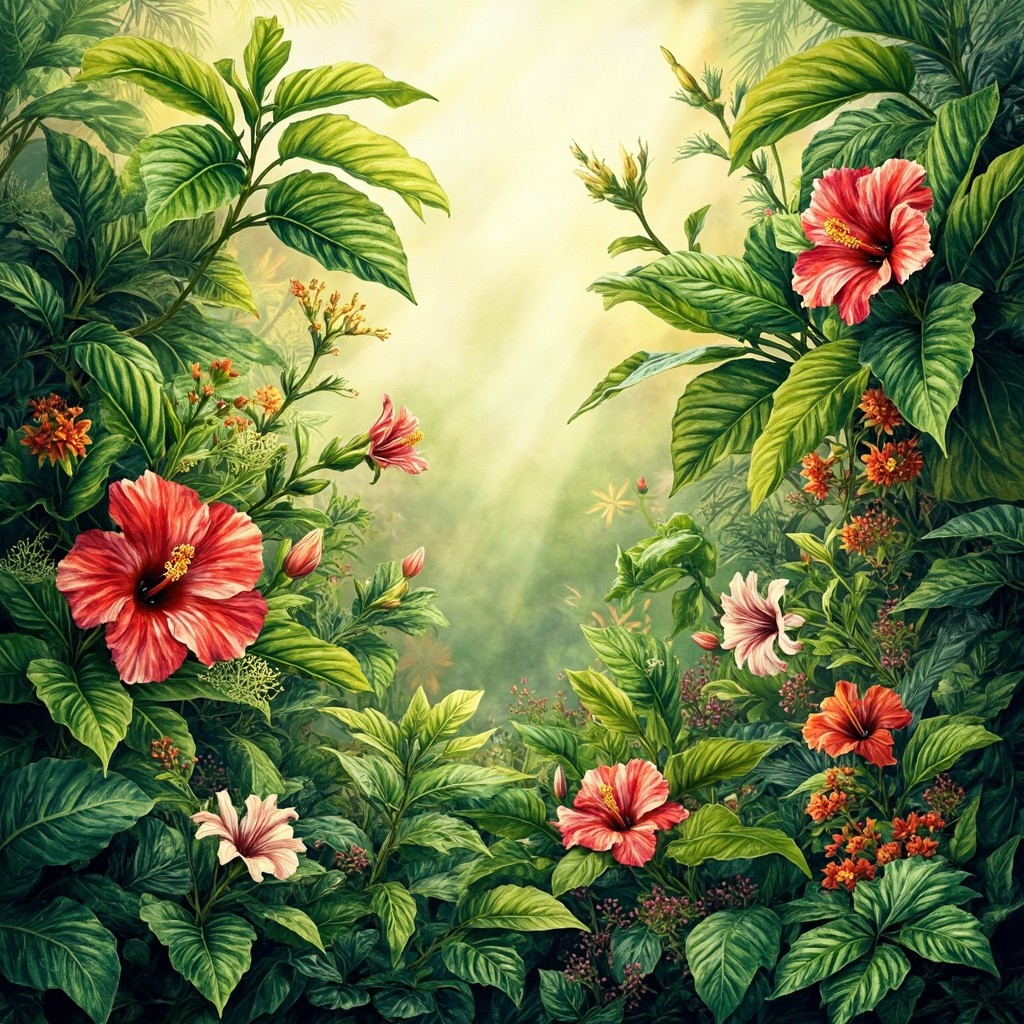 A vibrant, lush and hyper realistic African botanical photo featuring khamaré plants, hibiscus flowers, and other tropical African flora. Bright, colorful, and detailed, with a mix of large leaves and blooming flowers. Artistic style: hand-drawn watercolor with soft shadows and natural textures, realistic yet slightly stylized, showcasing the richness of African greenery. Include sunlight filtering through leaves, warm and inviting atmosphere, high-resolution, full-frame composition, no humans