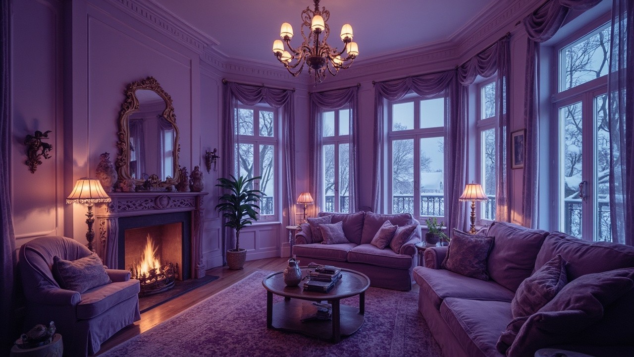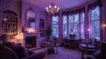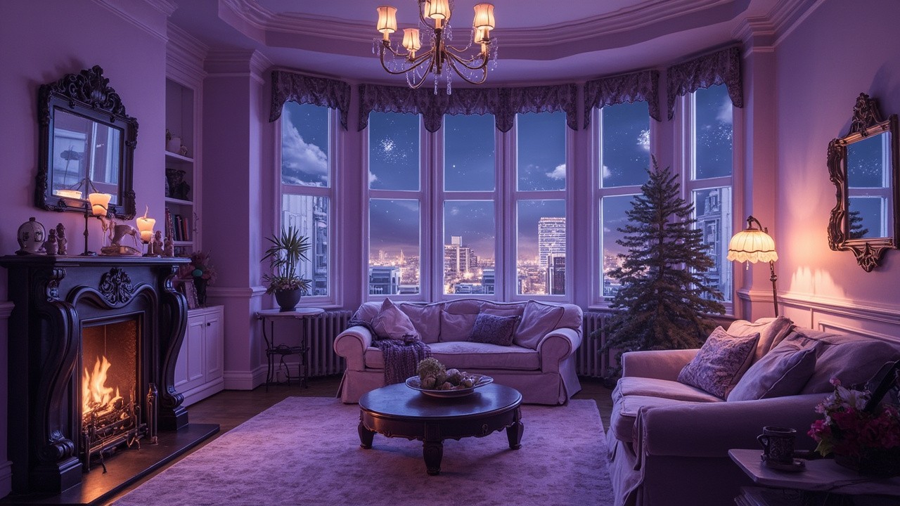 Cozy Classic Victorian Living Room in High Rise Apartment during Snowy Night