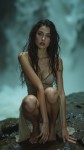 High-fashion editorial of a striking woman with very long, wet dark brown curls, vivid blue eyes, and full lips. She wears a sheer pale taupe dress, clinging to her body from the water and accentuating her very large bust. Barefoot on wet stone beside a powerful waterfall, mist rising around her. Cinematic Vogue-style lighting, raw and elemental atmosphere. Strong, grounded pose. Ethereal, primal beauty — she looks like she belongs to the earth and water. Professional photography. Shot with Canon EOS R5. Sharp focus. Intricately detailed.