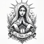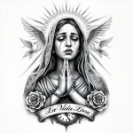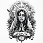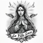 A Chicano-style black and gray pencil drawing of a weeping Virgin Mary with hands in prayer, surrounded by radiant light beams and roses. Her eyes are sorrowful yet peaceful, and her veil is decorated with fine lace patterns. Below her, two hands hold a rosary, and a banner flows across the bottom with ornate script lettering reading “La Vida Loca.” Surrounding elements include a clock with no hands, angel wings, and doves flying upward. The shading is soft but dramatic, with intricate linework and emotional symbolism throughout. Style: spiritual, tattoo-inspired, lowrider art aesthetic, detailed sketch.