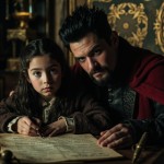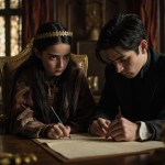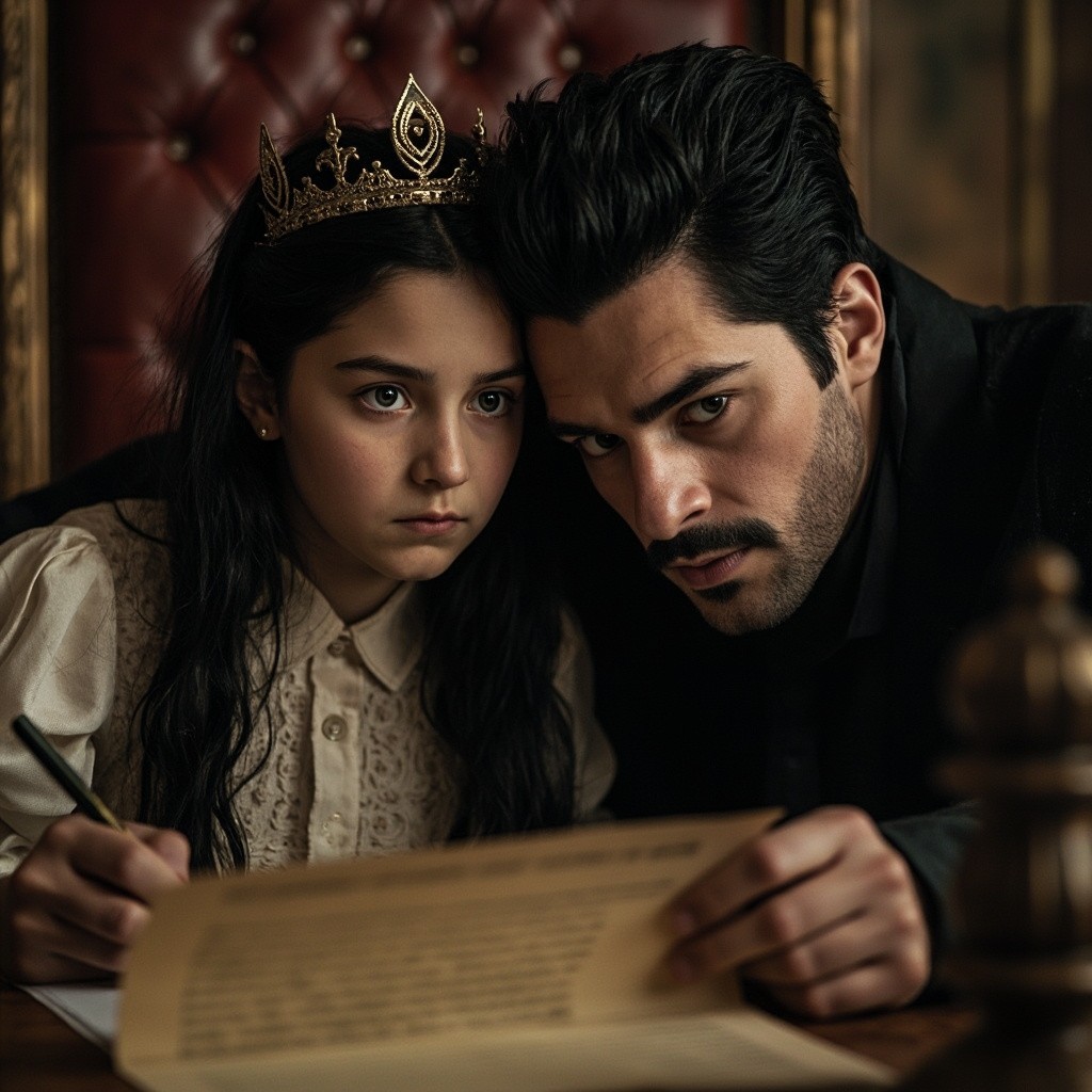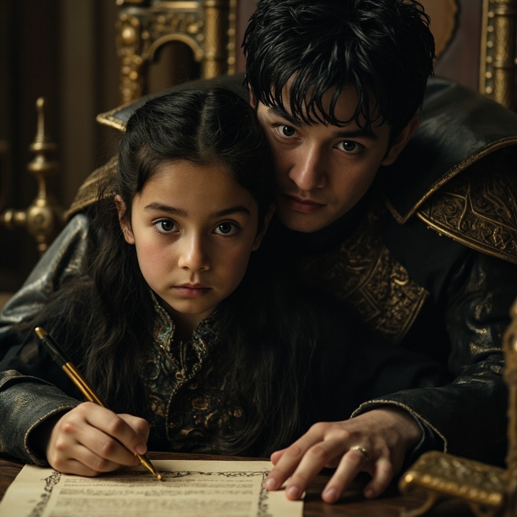 King Signing Ancient Contract with Young Girl in Throne Room