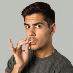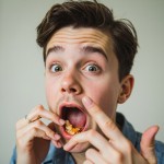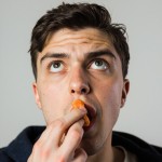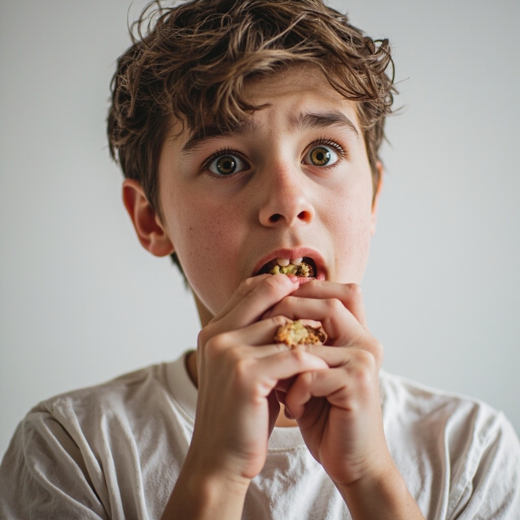 Young Man Pretending to Eat with Hand Gesture on Neutral Background