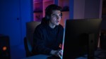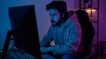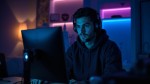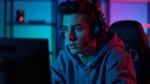 Young Man at Desk with Computer, Headphones, RGB Lighting, Minimalist Room