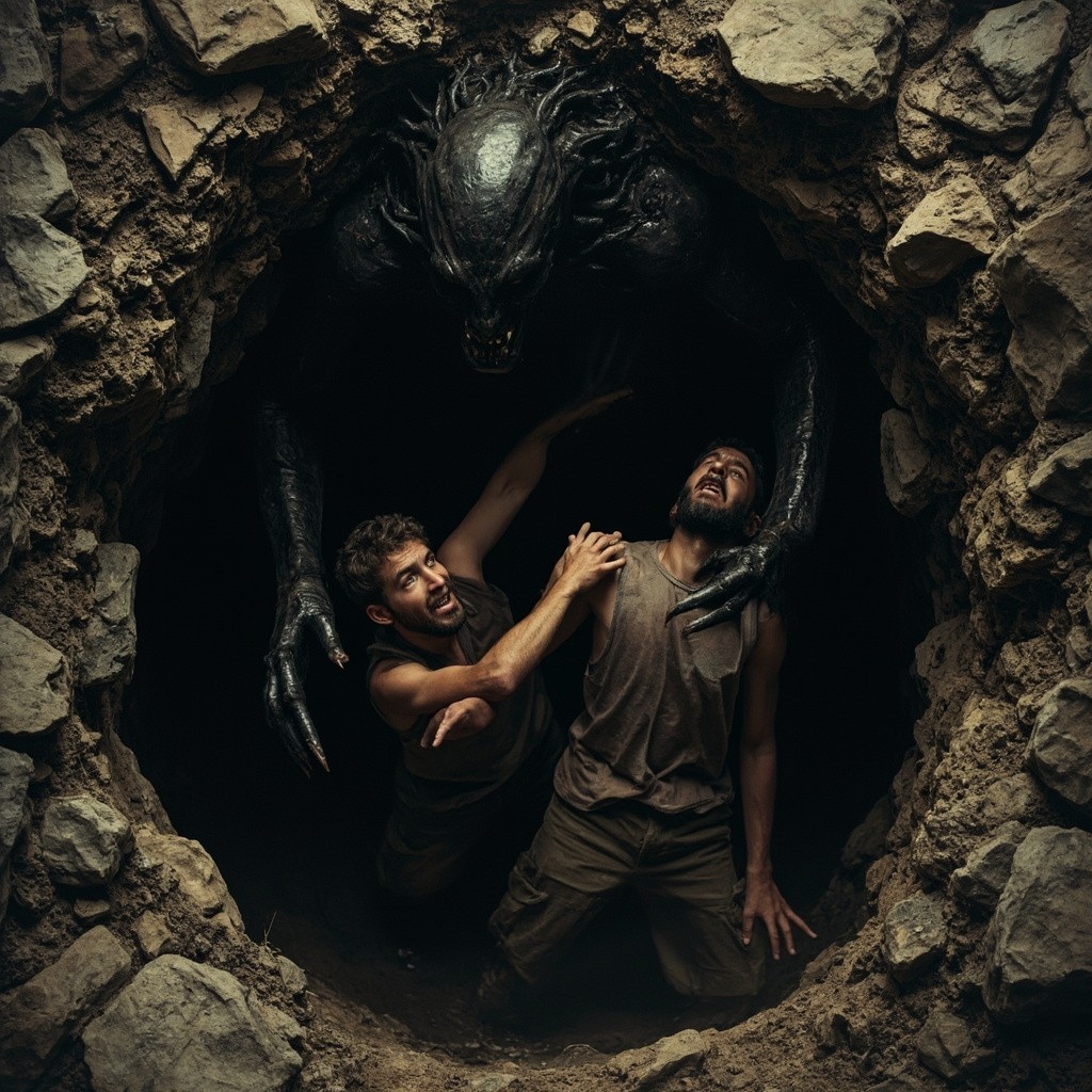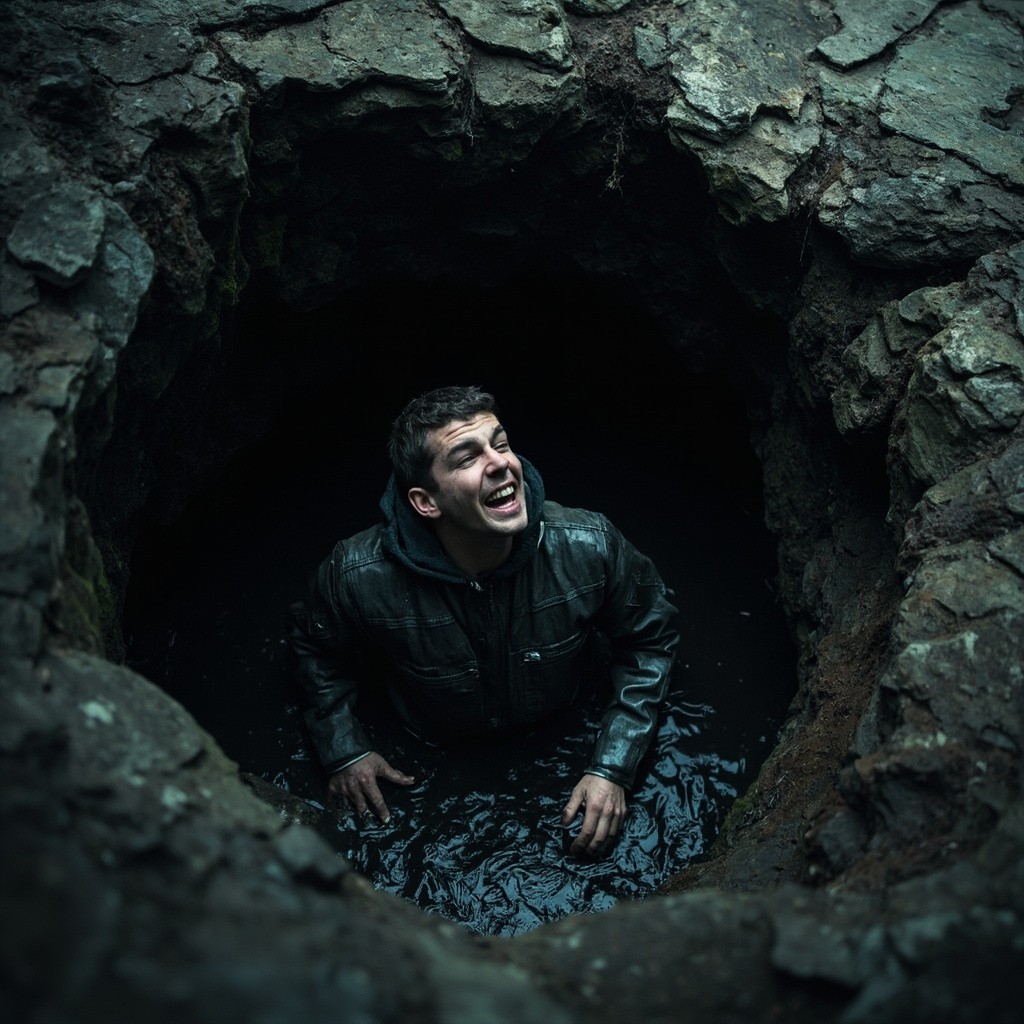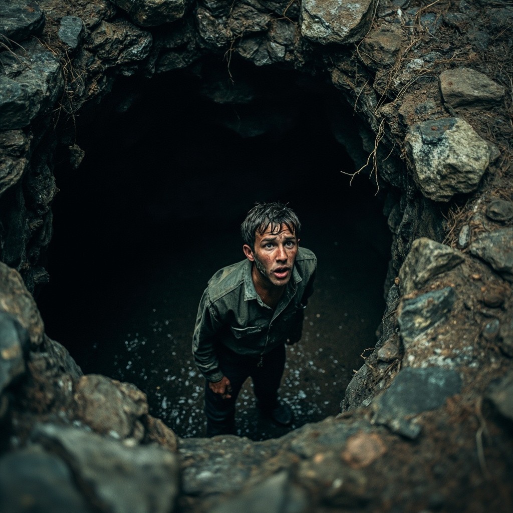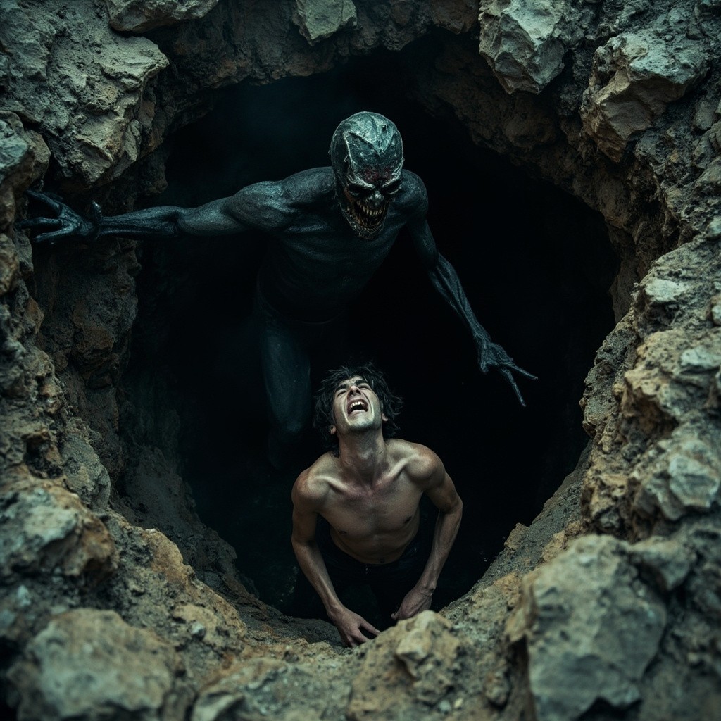 Young Man Tormented by Dark Entity in Deep Rocky Pit