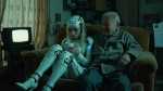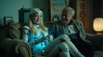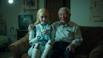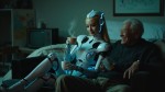 Korean Female Robot and Elderly Chinese Man on Sofa in Nighttime Bedroom