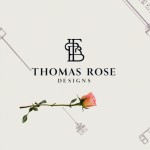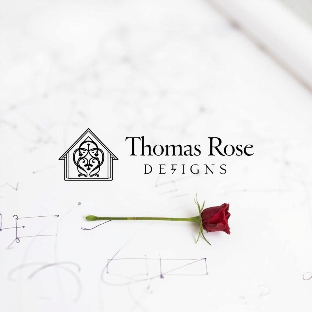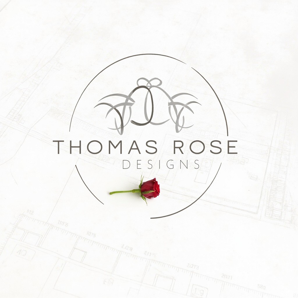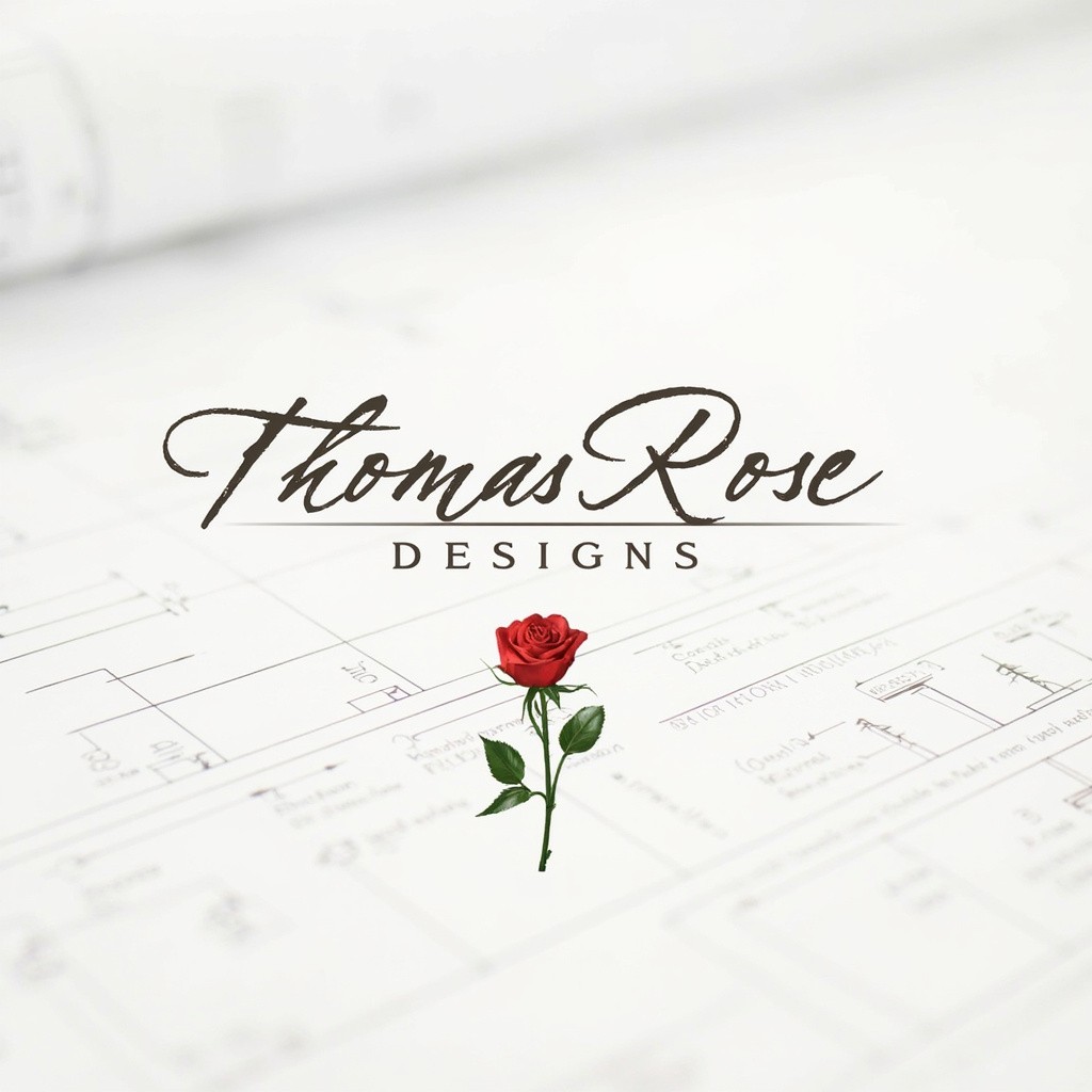 Thomas Rose Designs Business Logo with Horizontal Rose on Blueprint Background