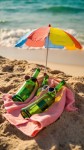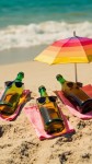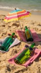 Sunny Beach Scene with Glass Bottles, Sunglasses, and Umbrellas