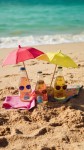 Three glass bottles lie separately on real sand, as if they were sunbathing by the sea. Each bottle wears sunglasses and a colorful beach umbrella appears on top. There is an individual pink towel under each bottle and they lie on it. The ground is completely covered with natural sand, and the scene near the sea is sunny and relaxed, evoking the mood of summer vacation.