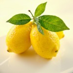 A photo-realistic close-up image of three fresh yellow lemons with dewdrops on their skin, arranged together on a glossy white surface. The lemons are adorned with vibrant green leaves covered in water droplets, capturing the freshness and natural texture of the fruit. High detail, bright lighting, soft shadows, minimal background.