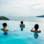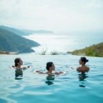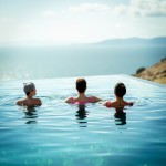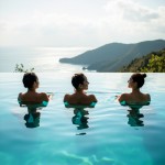Three Women Relaxing in Infinity Pool Overlooking Peaceful Sea Landscape