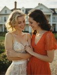 Two women in their mid-20s reuniting at Martha's Vineyard, for the summer season. Both come from Connecticut's Gold Coast of extremely wealthy, old money Connecticut families. One woman is blonde and the other woman is brunette, they don't look like one another but they've never minded, now in their mid twenties back at Martha's vineyard again. They are captured mid-laughter, in a candid intimate moment. Their energy is relaxed but elegant. They wear different color dresses but both are still appropriate for the New England Gold Coast season on the Vineyard. As the two woman, empbrace and chat it can be seen that both women have dewy, fresh skin and soft natural lips. They stand together, laughing warmly while standing in front of their giant mansion complex on Martha's Vineyard. The entire setting feels untouched by time — like a frame from a Sofia Coppola film or a Vogue editorial. The moment is intimate, chic, and utterly timeless.