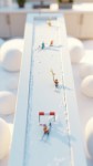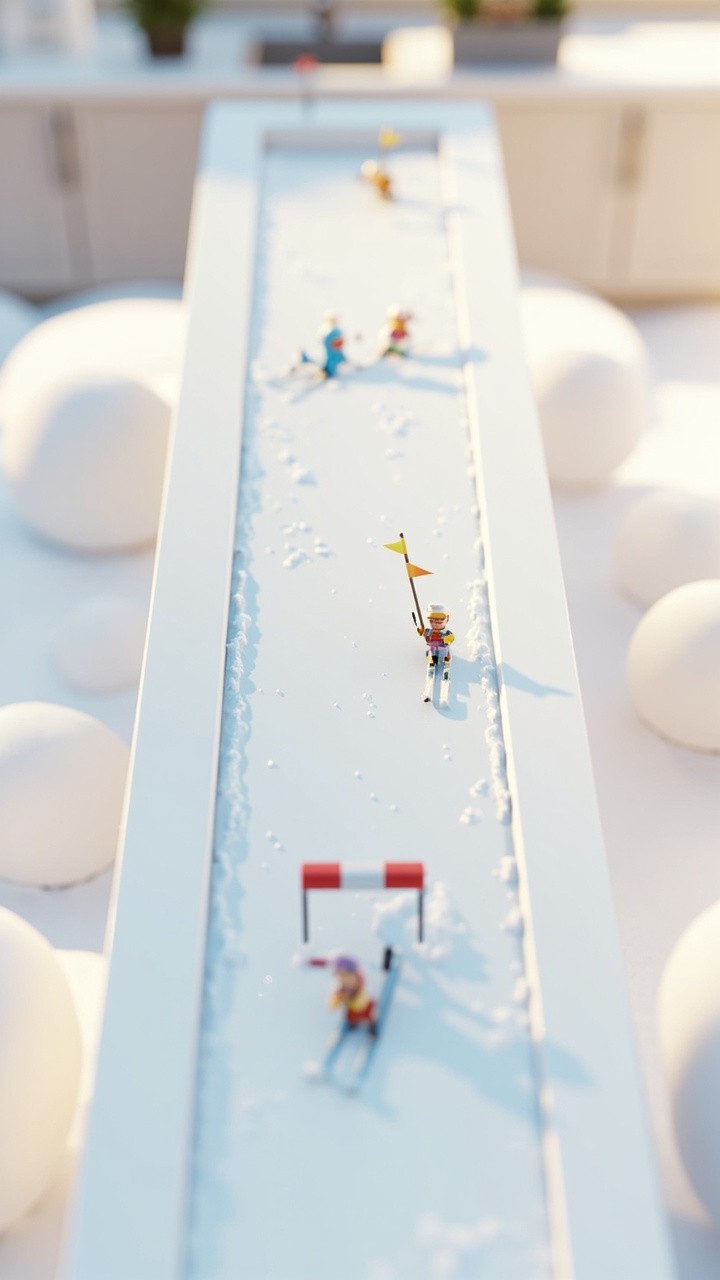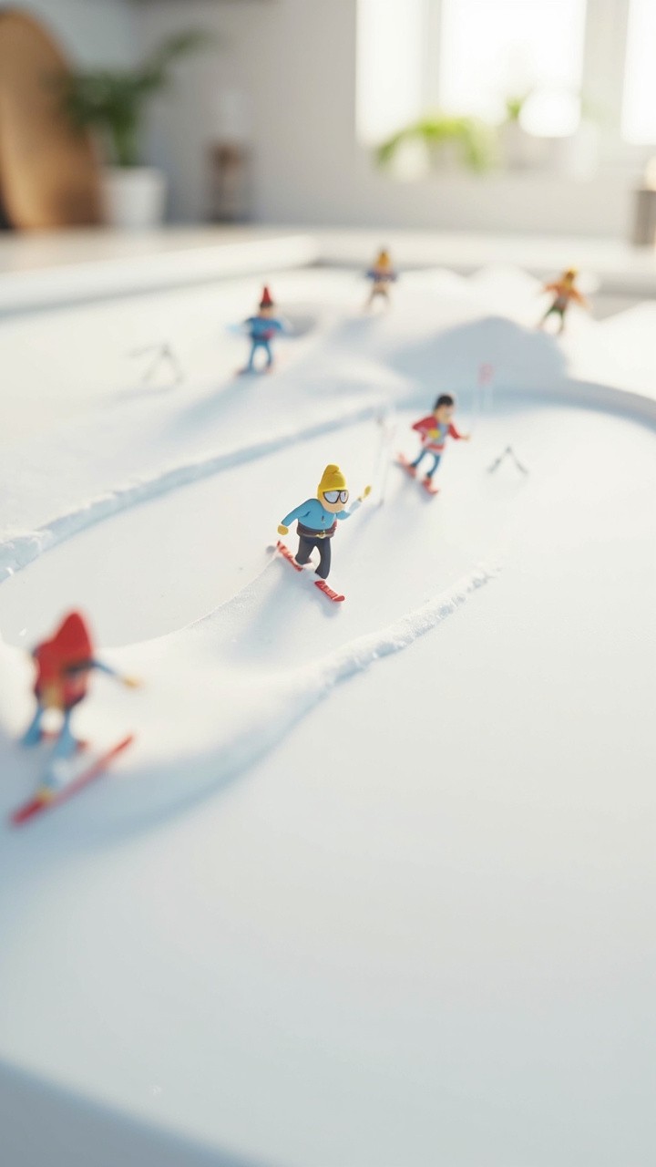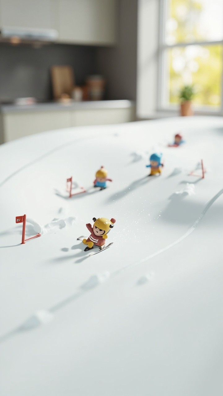 reate a high-quality, fully animated 3D scene where tiny cartoon skiers are skiing down a perfectly smooth, matte lacquered kitchen cabinet door as if the cabinet door is a snowy ski slope. The cabinet door must look realistic, lacquer-painted, ultra-smooth, with no wood grain, and styled as a modern kitchen cabinet front (such as shaker or flat panel). Add miniature snow effects, small ski gates/flags, and playful motion trails behind the tiny skiers. Include 3–5 tiny skiers, each with different colors and cute ski outfits. Their movement should feel dynamic, fast, and fun—some making sharp turns, one falling and getting up, one doing a tiny jump off a small bump on the cabinet surface. Surrounding environment: a clean, modern kitchen background blurred with soft depth-of-field, so the focus stays on the cabinet door slope. Lighting should be bright, cinematic, and slightly reflective to highlight the matte lacquer texture. Add gentle sparkles on the surface to emphasize the smoothness. Camera movement: start with a close-up of the lacquered cabinet surface, then pull back slightly to reveal the tiny skiers sliding down the door. Use smooth animation, soft shadows, and a polished high-end look. Keep it cute, funny, premium, and visually clean. No text, no logos.