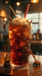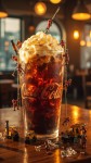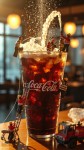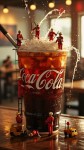 A transparent cup filled with a gigantic hyper-realistic McDonald's Coca-Cola stands on a wooden table, looking super-huge compared to the super-tiny people surrounding it. Twenty super-tiny firefighters in red and white uniforms use cranes, ladders and hoses. Some climb tiny ladders to pour soda, while others adjust the foam with hoses as if they were rushing to the scene of a fire. Some spray soda with firefighter hoses, while others climb ropes attached to cups. The group is immersed in overflowing soda. Miniature forklifts and trucks deliver ice, filling the sides of the cups with ice. Condensation droplets on the cups sparkle under the bright lighting, reflecting the atmosphere of a cafe with a warm surface. The scene features a vibrant and refreshing atmosphere with cinematic lighting, hyper-detailed textures, realistic reflections of water droplets, and blurred lights in the background of a cozy cafe. The world of the little people. A