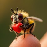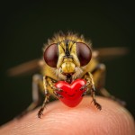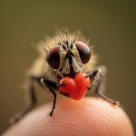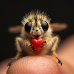 Hyperrealistic macro photograph, styled as a 3D render, featuring an impossibly cute, fluffy insect resembling a tiny fly. This creature boasts oversized, expressive, soulful eyes and a gentle, heartwarming smile. It delicately clutches a small, vibrant red heart between its foremost appendages, stylized charmingly like paws. The miniature insect is perched lightly on the tip of a human finger, highlighting the scale contrast. Focus on intricate fuzzy textures, detailed yet adorable anatomy, soft lighting, and a shallow depth of field that emphasizes the subject.