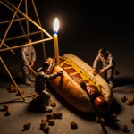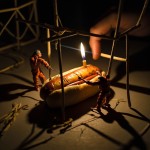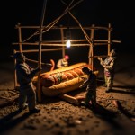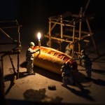 Tiny Workers Repairing Giant Hot Dog at Night
