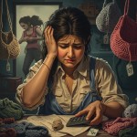 Mujer artesana de crochet cansada, rodeada de varias carteras hechas a crochet terminados, con etiquetas de precio muy bajos colgando ($5, $7). En una mano tiene una calculadora y en la otra sujeta la cabeza, mostrando frustración. En el fondo se ve una clienta feliz llevándose un bolso, mientras la artesana se queda agotada y desmotivada. Estilo ilustración digital semi realista, colores suaves, luz tenue que refleje esfuerzo sin recompensa.