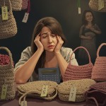 Tired Crochet Artisan Surrounded by Low-Priced Handbags, Semi-Realistic Digital Illustration
