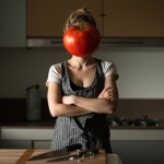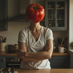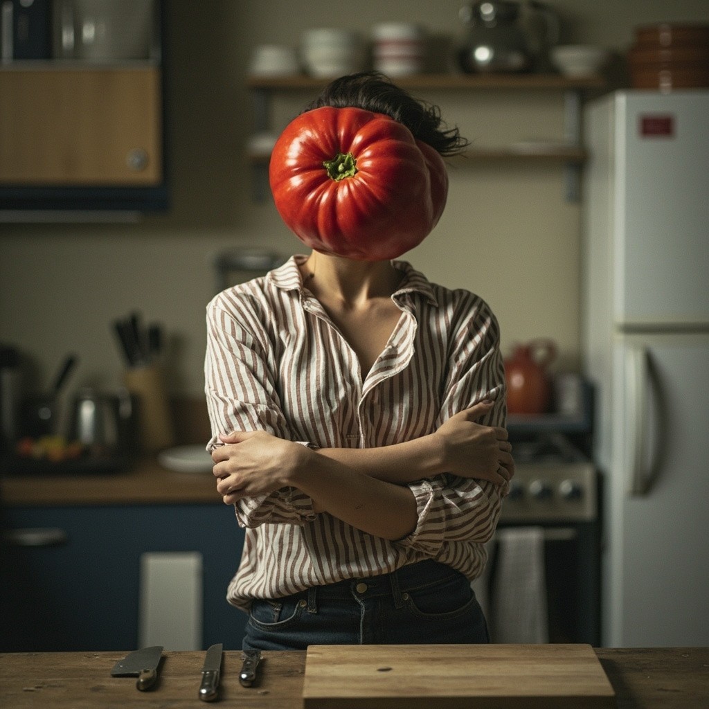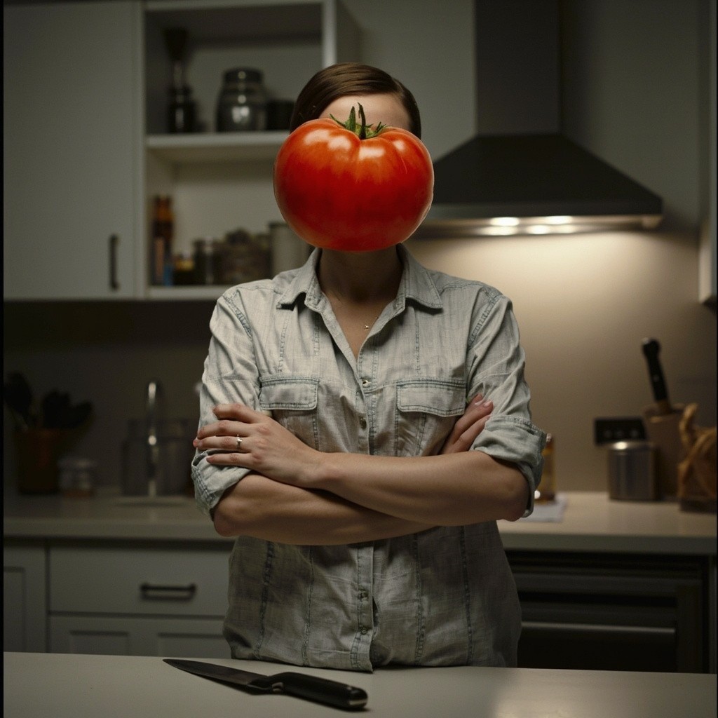 Woman with Tomato Head in Kitchen, Arms Crossed Near Knives