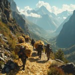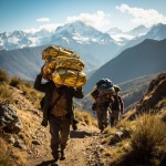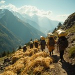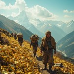 Traders Carrying Gold Up Mountain on Sunny Day, Rear View
