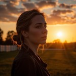 Transform this image into a dramatic sunset HDR style while preserving 100% of the original content. Do NOT change, add, remove, replace, or distort any object, subject, tree, fence, grass, sky, or background. Maintain the exact same composition, framing, perspective, camera angle, subject position, shapes, and proportions. Apply photorealistic sunset lighting with warm golden-orange tones in the sky and subtle soft shadows on the subject’s face and clothes. Enhance dynamic range naturally. Colors must look realistic, not oversaturated, not artificial. No fantasy effects, no extra clouds, no extra sun, no lens flares, no fog, no rain unless already present. This is strictly a realistic color and lighting transformation only. The original image must remain perfectly recognizable.
