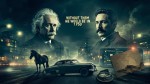A composite photograph blending two scenes: a modern illuminated cityscape at night with glowing buildings and street lights, alongside a progressive darkening of these elements through broken light bulbs and severed power cables. A modern car with a horse standing beside it occupies the foreground. An old paper map and compass overlay a smartphone displaying an active GPS screen. Large portraits of Albert Einstein and Nikola Tesla, rendered in semi-transparent style, are prominently positioned in the upper portion of the image with clear facial features and recognizable likenesses ensuring they are clearly visible and identifiable. The text "SIN ELLOS ESTARIAMOS EN 1950" appears in very large bold typography. The entire image maintains a dystopian atmosphere through the juxtaposition of functioning and failing technology. Digital photo composite with dramatic lighting contrasts between illuminated and darkened areas, using multiple exposure techniques to blend realistic and graphic elements.