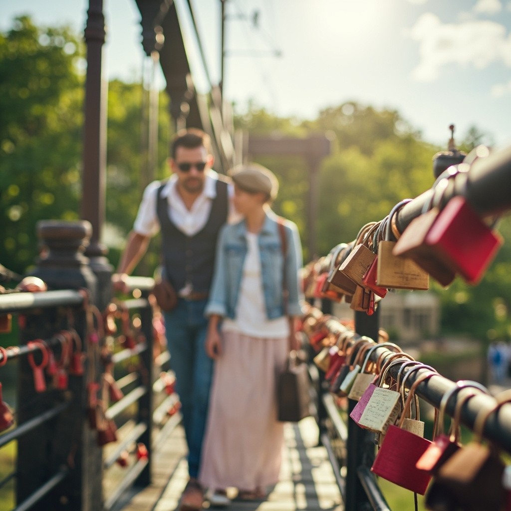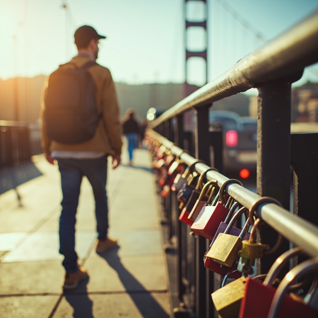 Traveler Strolling on Bridge with Love Locks in Daylight