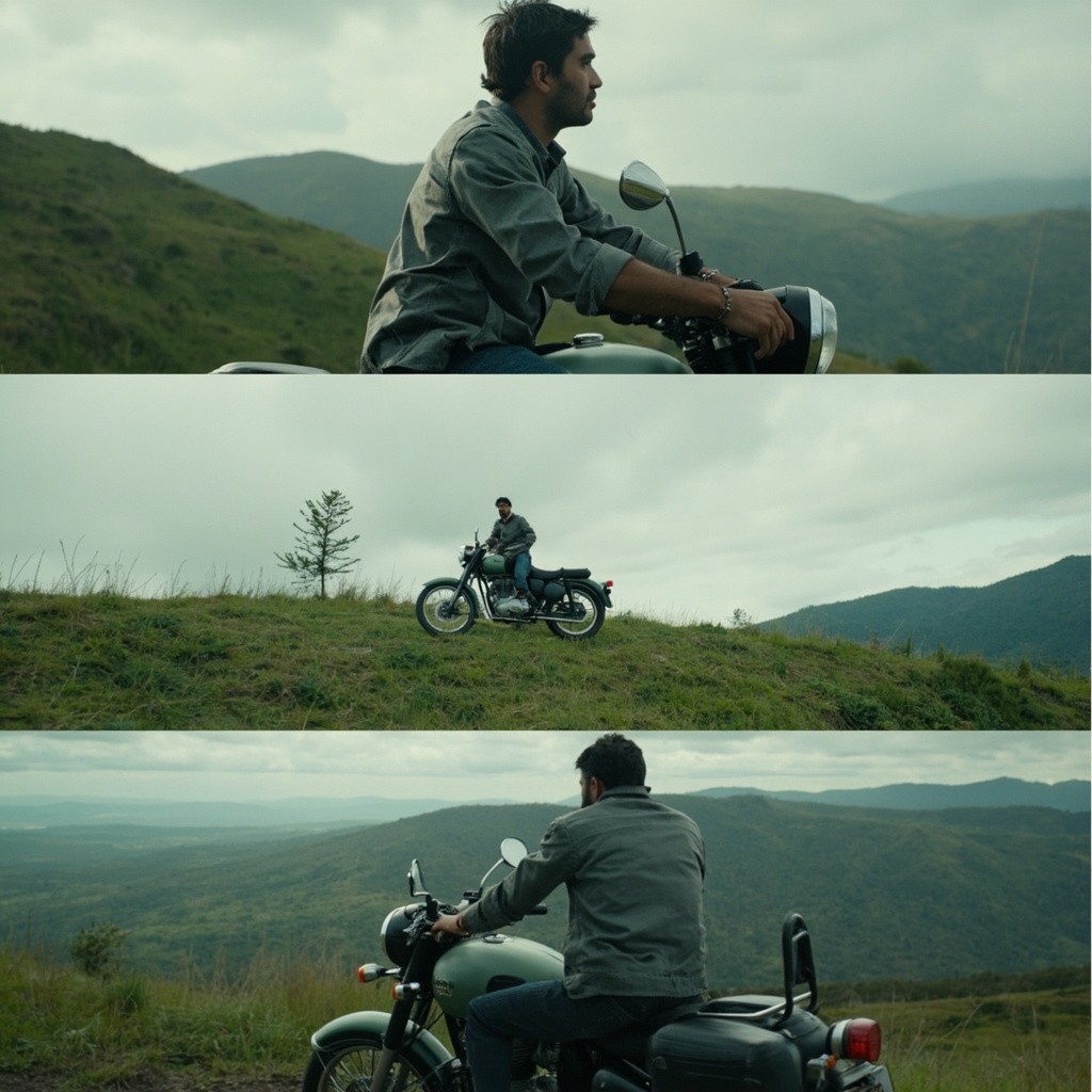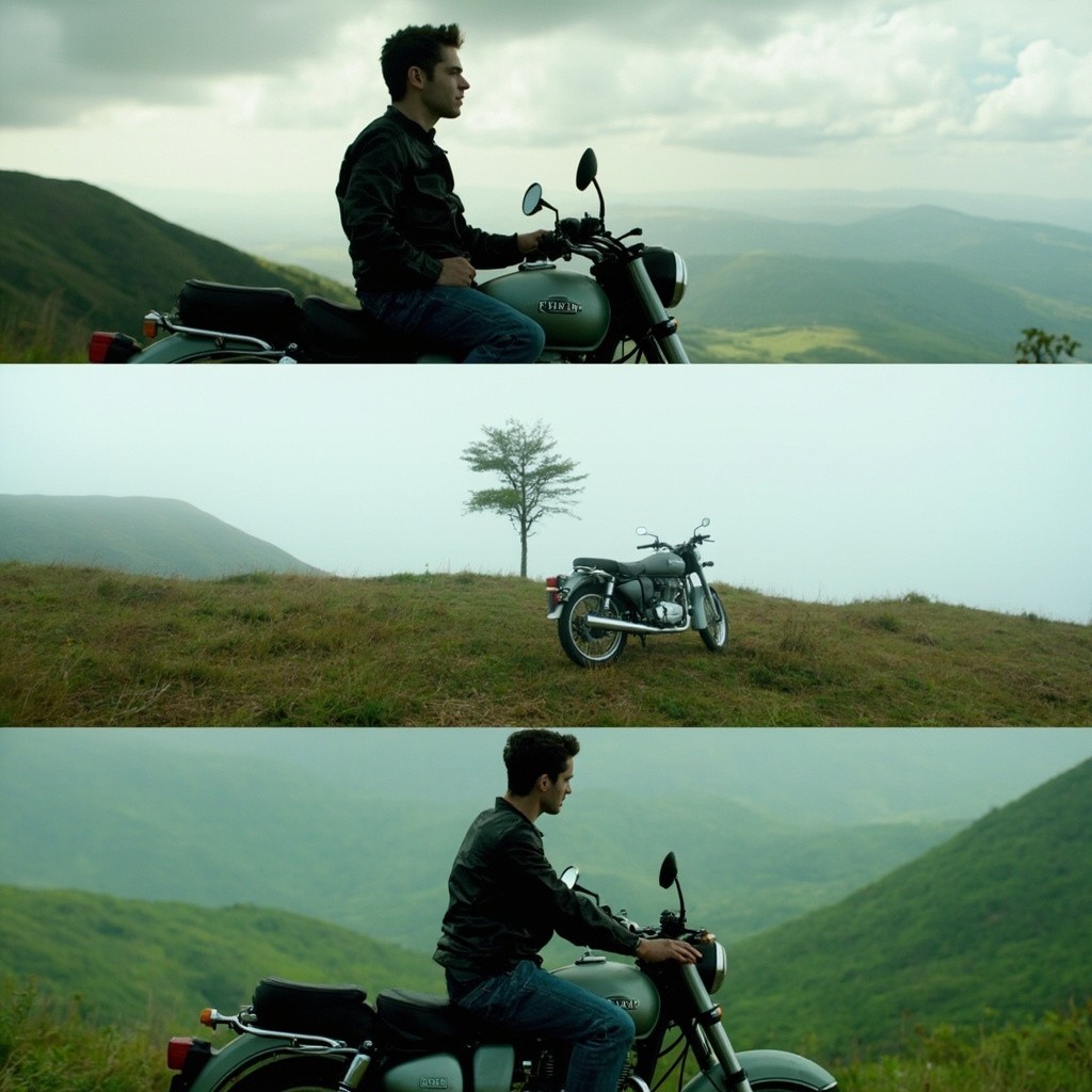 Prompt:2878 Vertical triptych collage featuring a young man with his original face and a matte greyish-green Royal Enfield Classic motorcycle in a lush mountainous landscape under soft overcast light — top: low-angle medium shot sitting on bike looking right against cloudy sky; middle: wide shot bike alone on grassy ridge with single tree and distant hills; bottom: rear view sitting on bike facing vast green valley, left side profile visible with black seat, round mirrors, side panel.