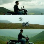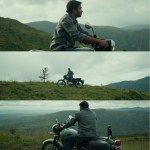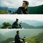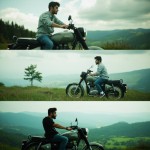 Vertical Triptych Collage of Young Man and Matte Green Royal Enfield Classic Motorcycle in Mountain Landscape
