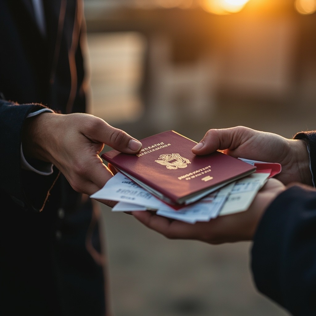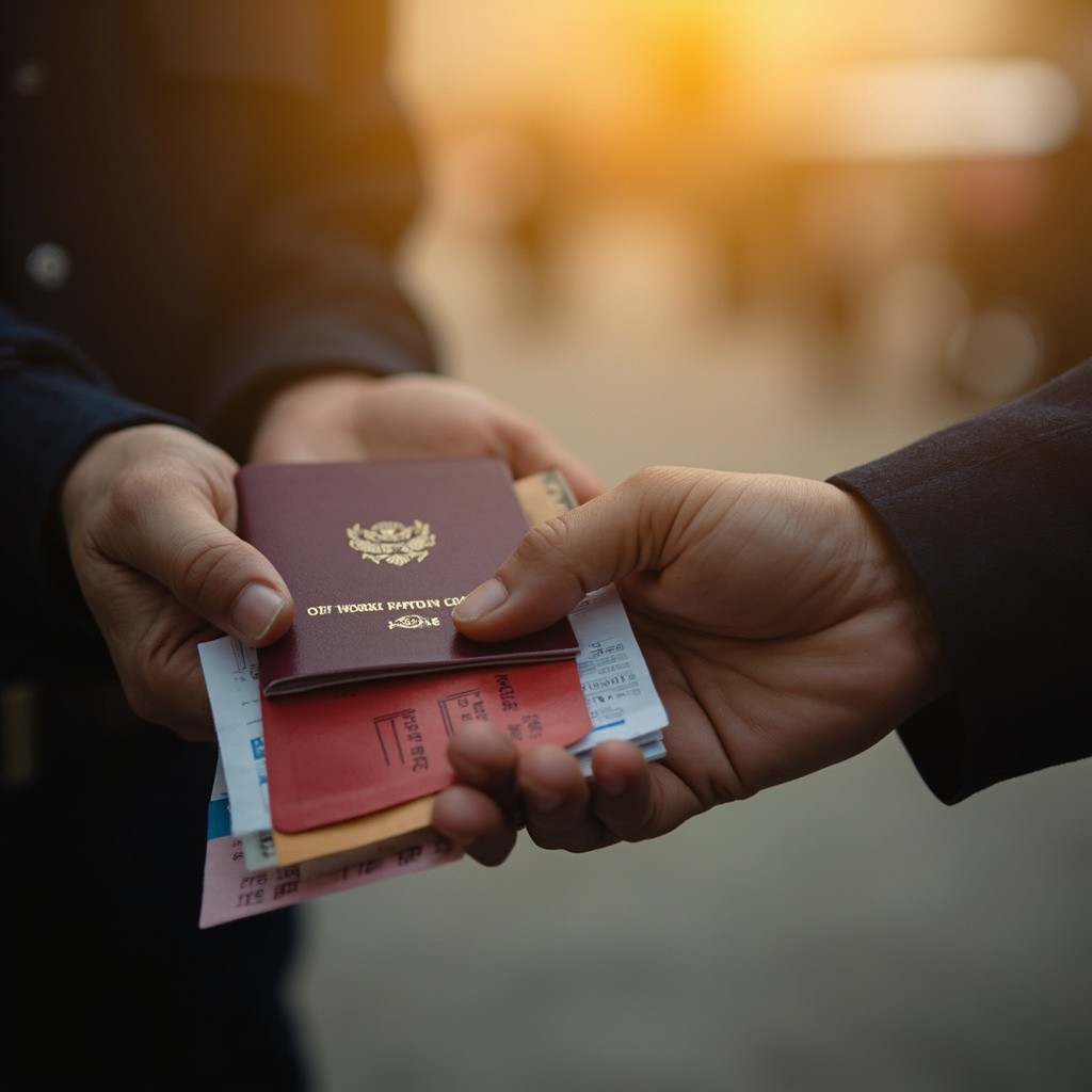 A highly detailed, hyper-realistic shot in landscape orientation from an over-the-shoulder perspective. Two hands gently handing over a set of official documents (a burgundy passport, a red work patent card, and some receipts) to another pair of hands. The hands are positioned further away from the camera, creating more space in the composition. The receiving hands are wearing the dark blue fabric of a police uniform sleeve. The scene conveys trust and peaceful interaction. Soft, warm sunset light creates a golden rim light on the edges of the hands and documents. Cinematic composition, shallow depth of field, the background is completely blurred (bokeh). The documents are completely free of any text, letters, numbers, or inscriptions — only solid colors and blank surfaces are visible. Focus is on the overall scene and the gentle gesture of handing over. 8k, shot on 50mm lens, f/1.4, natural skin texture, soft lighting