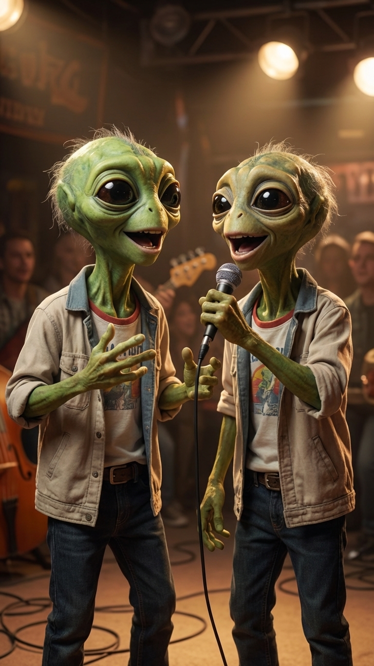 Quirky image of two aliens dressed casually singing a duet.