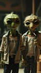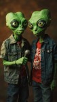 Two Green-Headed Aliens Singing, One Holding Mic