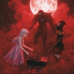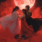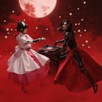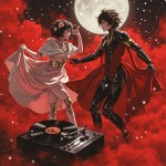 snowflakes falling, snowflakes on his body, two cyborg robots,Both are in sci-fi clothes. One girl in white and pink, the other in black and gold,girl dressed in a flowing red gown, dancing around a vinyl record player. They are surrounded by crimson smoke, with a full moon in the background. The scene is in an anime style, with a dark art aesthetic and a red color scheme. The image is highly detailed and of high resolution, resulting in a high-quality visual.