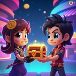 Cartoon Characters Exchanging Glowing Treasure Chest in Colorful Futuristic Video Game Universe