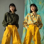 Modern Fashion Models in Oversized Mustard Yellow Trousers with Abstract Background