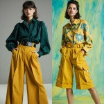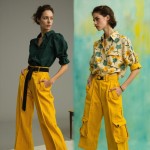 A high-fashion editorial-style image showcasing two modern, confident female models wearing contemporary, oversized mustard-yellow trousers. The left model wears wide-leg, high-waisted pleated trousers with a black belt and a dark forest green tucked-in blouse with puffed sleeves. The right model sports cropped mustard trousers with a cargo pocket and belt tie details, paired with a matching embroidered shirt featuring soft floral patterns in teal. The background is split — one is a clean grey studio setup, and the other is a painterly, abstract turquoise and yellow backdrop. Both models have chin-length, textured hair and confident expressions. The styling is bold, artistic, and runway-ready.