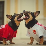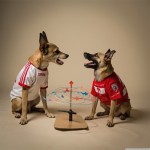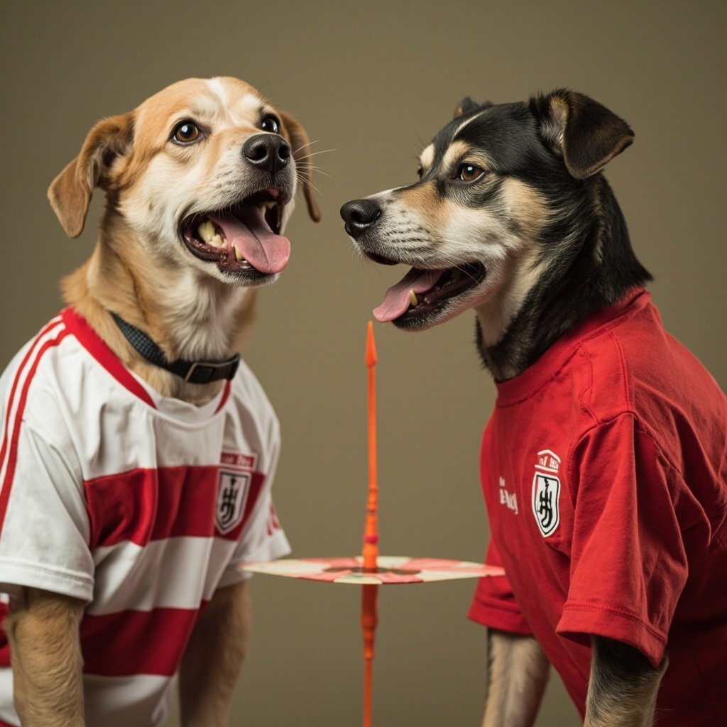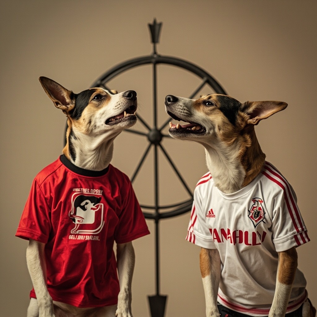 Dogs Playing Spin-the-Arrow Game, One in Al Ahly T-Shirt, Another in Zamalek T-Shirt