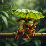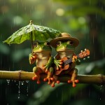 Anthropomorphic Frogs on Bamboo Branch in Rain with Leaf Umbrella and Ukulele