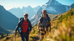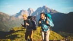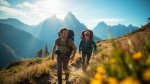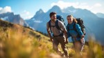 Two happy hikers climbing a mountain trail with backpacks on their backs, surrounded by beautiful mountain peaks and a clear sky in the background. The image should be mid-distance — not a close-up, but not too far away — showing the hikers clearly within the scenic landscape. Natural lighting, vibrant colors, and a sense of adventure