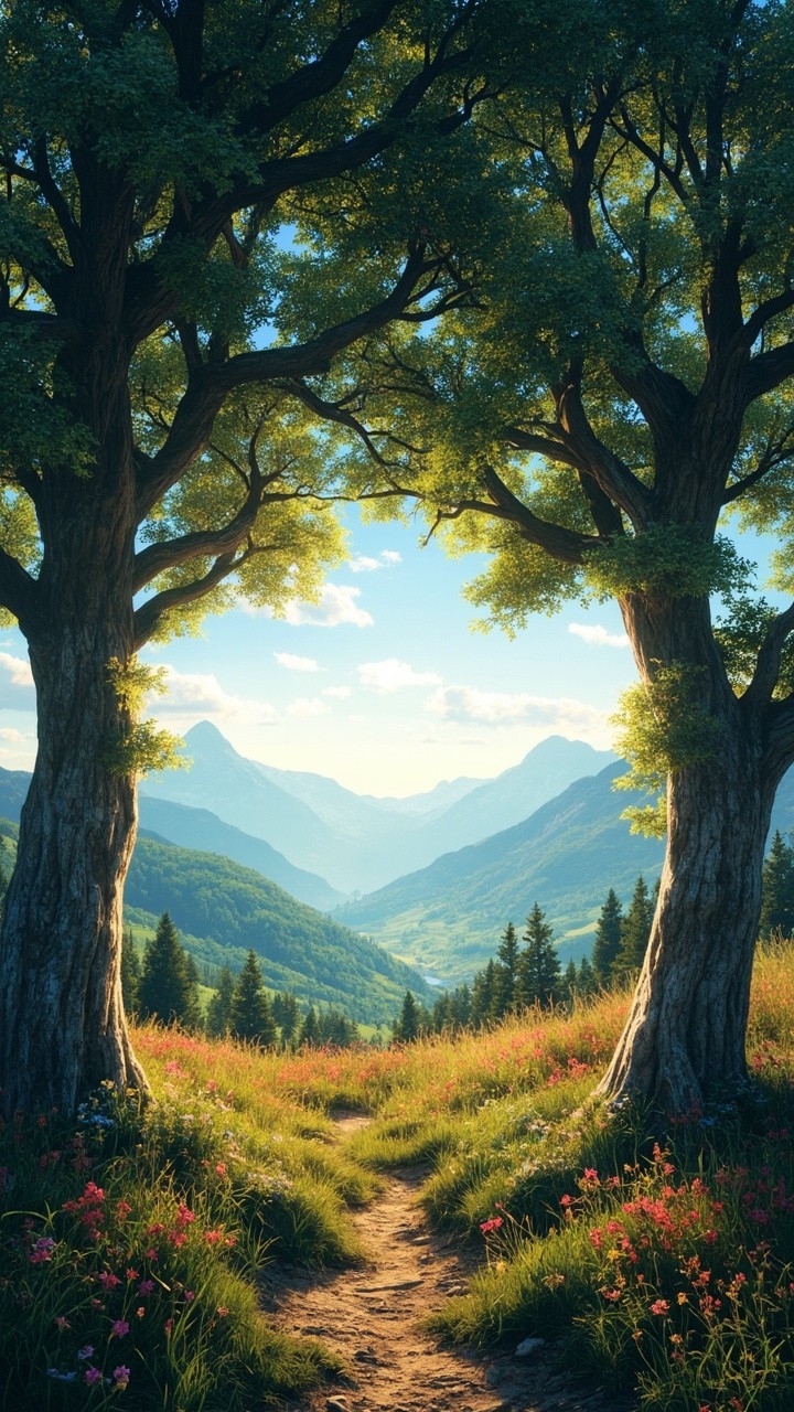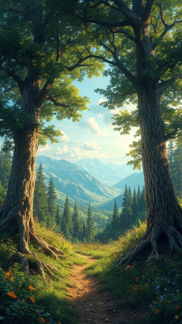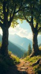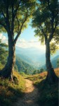 Realistic Trees with Beautiful Pathway Scenery of Wild Trees and Mountains